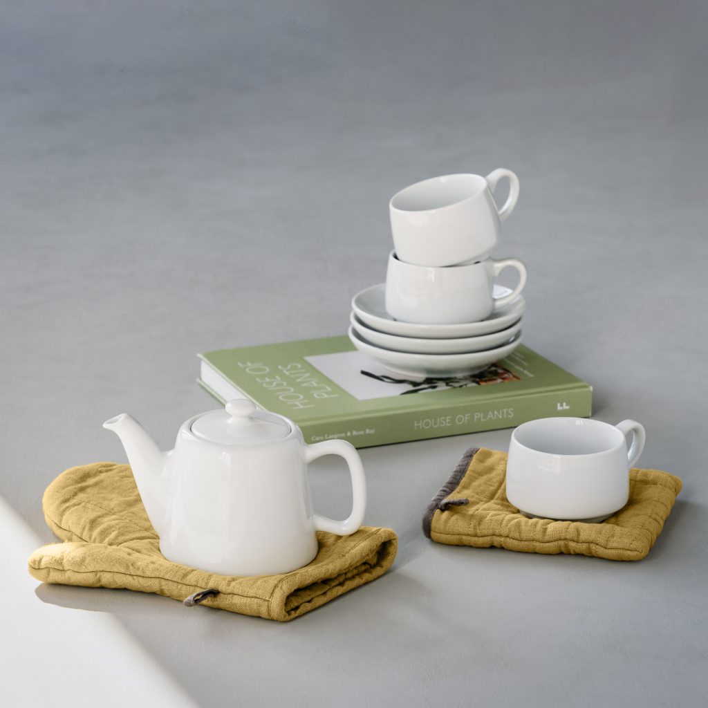 除了人氣品補貨,Lino e Lina秋冬新色也趕在這波上架!選擇了帶灰調的沉穩復古黃,降低亮度後,更能襯托亞麻天然的織紋與手感。推出包含方形兩用隔熱手套、隔熱手套、廚房拭巾、圍裙等品項。
