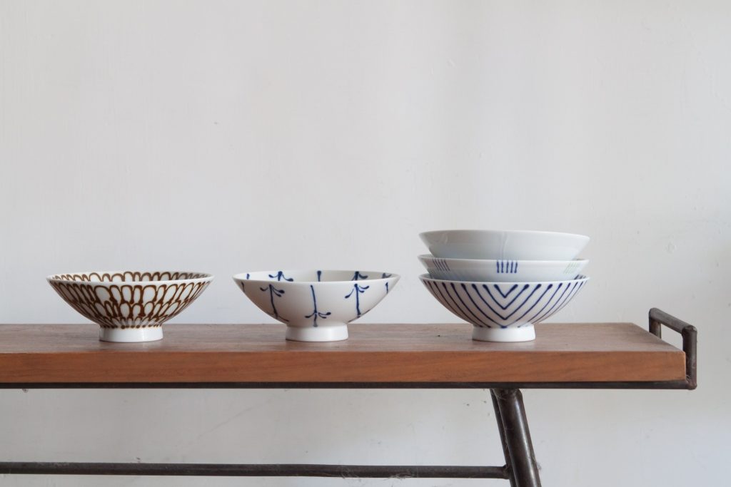 由森正洋設計的平茶碗,是小器長年深受喜愛的定番食器。錐形、淺身的器型,拿在手中格外好握;設計時特別考慮下筷角度,碗口直徑較一般飯碗略大,盛裝飯菜更顯自在。適中的深度,也讓它不只作為飯碗使用,盛放涼菜、小缽或點心,同樣順手實用。